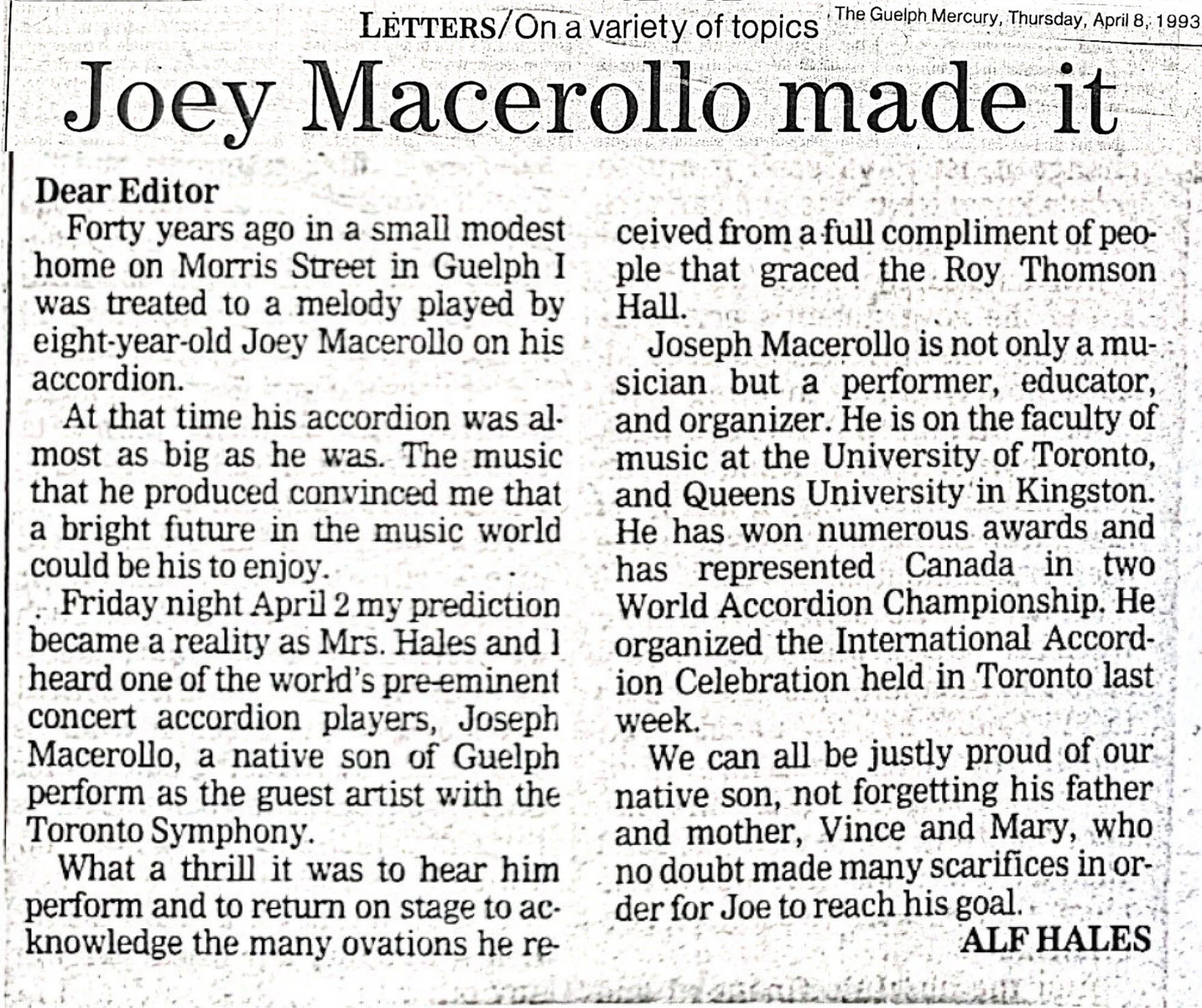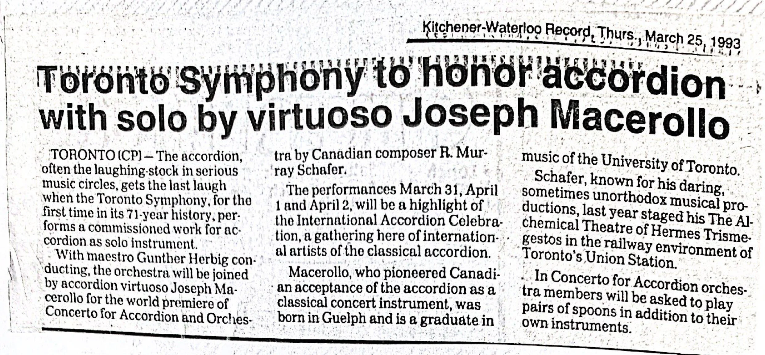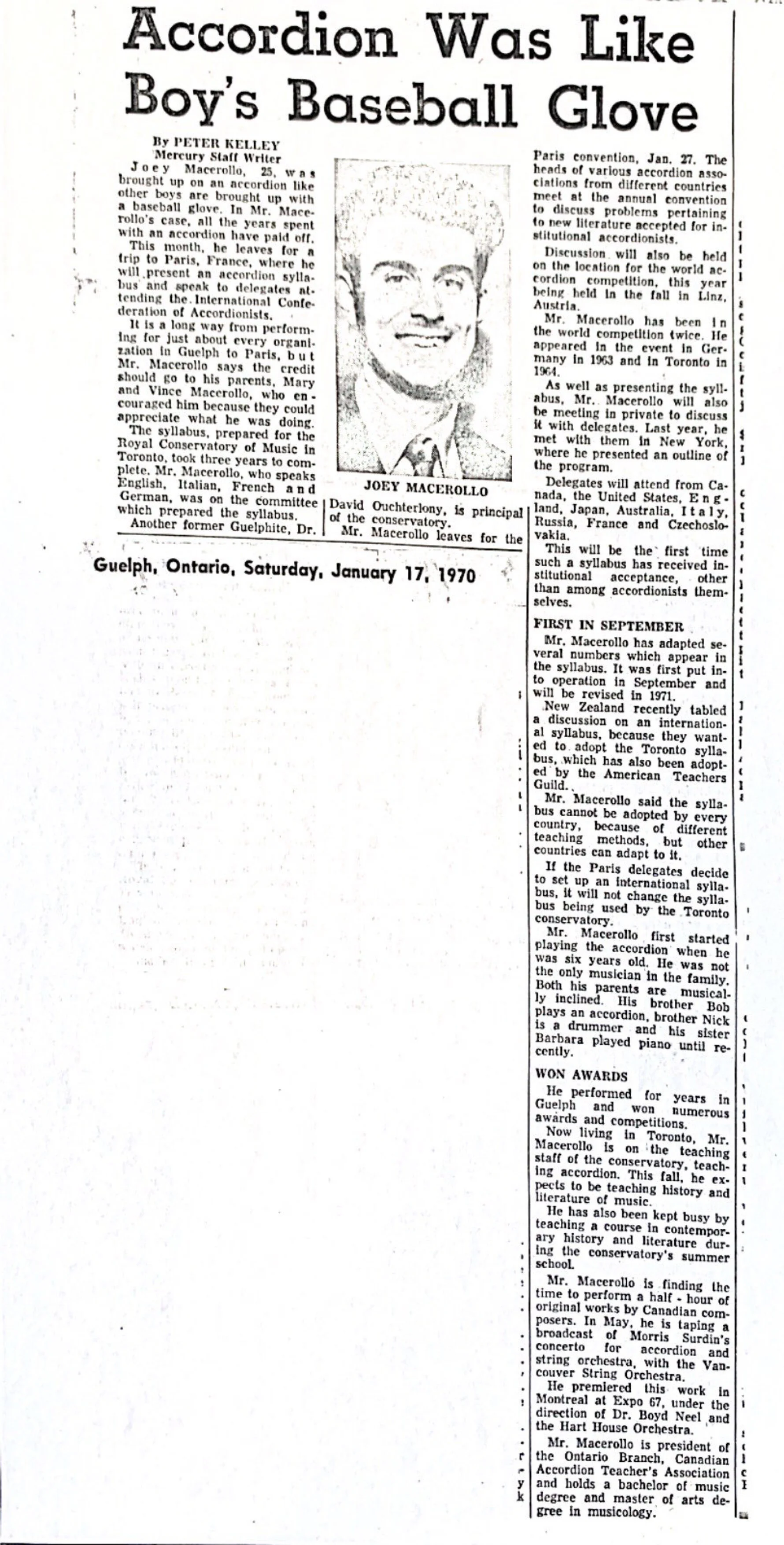 Accordion Master Joseph Macerollo to receive the Order of Canada, Guelph Mercury Tribune